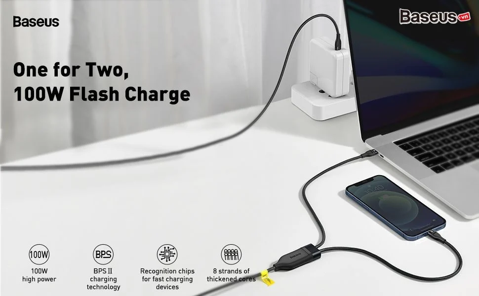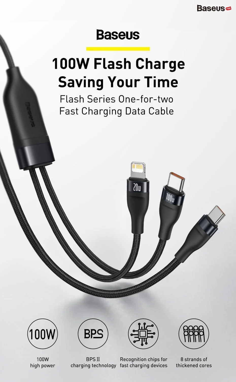 Dây sạc 2 đầu C to C+Lightning 100W Baseus Flash 3